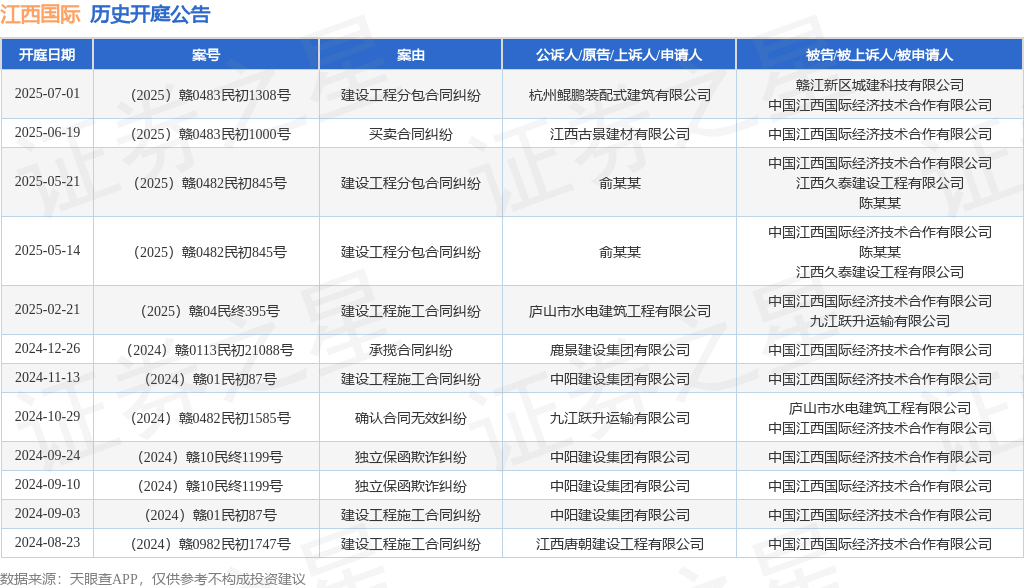 案号:(2025)赣0483民初1308号审理法院:星子县人民法院案由:建设工程分包合同纠纷当事人信息: 原告/上诉人:杭州鲲鹏装配式建筑有限公司 被告/被上诉人:赣江新区城建科技有限公司、中国江西国际经济技术合作有限公司开庭日期:2025年7月1日根据统计,近一年内以中国江西国际经济技术合作有限公司为当事人的历史开庭公告有12则,其中案由为“建设工程施工合同纠纷”的公告以4则居首,其次为“建设工程分包合同纠纷”有3则,“独立保函欺诈纠纷”有2则。历史开庭公告如下: